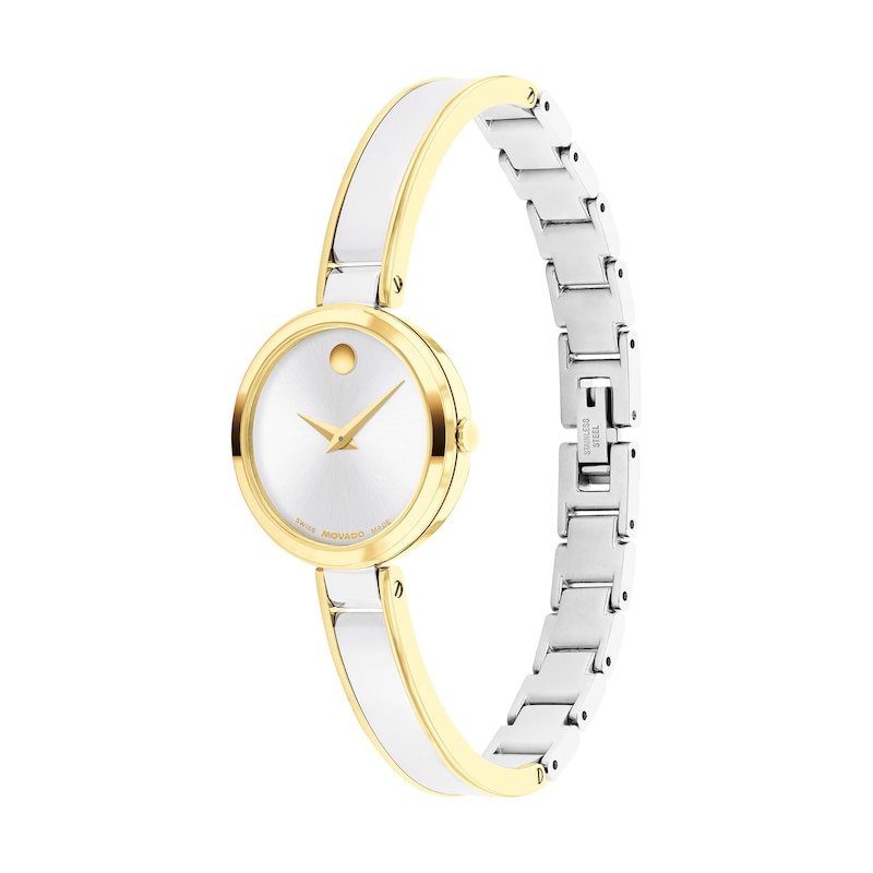 Have a question about Ladies' Movado Moda Two-Tone PVD Bangle Watch with Silvery-White Sunray Dial (Model: 608012)?